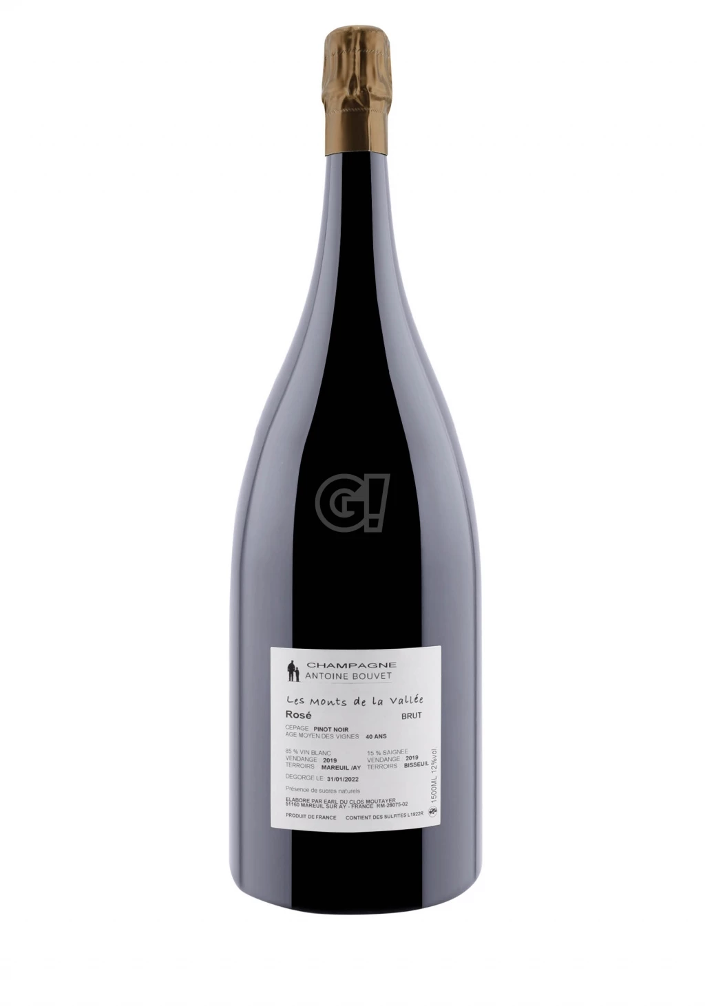 The Champagne Rosé Les Monts de la Vallée by Antonie Bouvet is the result of 85% Pinot Noir from vineyards of about 40 years of age located in the villages of Mareuil-sur-Aÿ and Bisseuil whit the addition 15% vin rouge. Vendage 2019 and Brut dosage (5 g/l) for this Champagne Rosé of great style and pleasantness. Produced in extremely limited quantities.