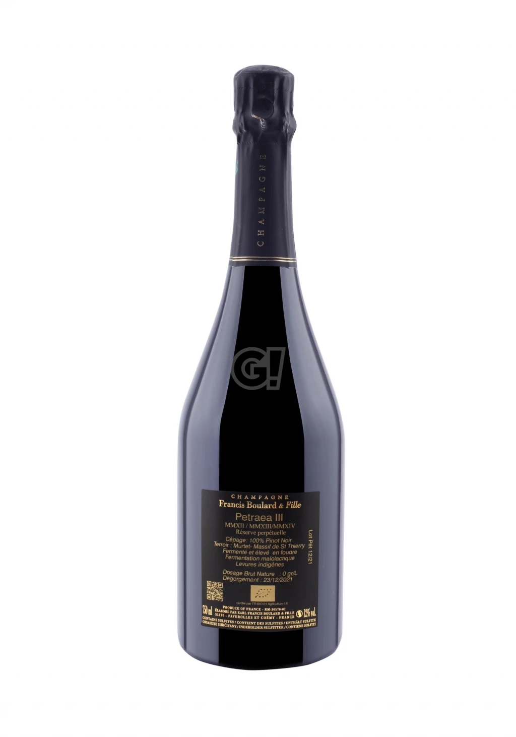 The Champagne Brut Nature Petraea II has always been a perpetual Cuvée, pbtained through Solera method applied to Champagne. With the 2013 vintage, this extraordinary Cuvée has been re-proposed in a certified Bio version. Result of 100% Pinot Noir from the lieu-Ddit “Le Murtet” on the sandy, calcareous terroir of the Saint-Thierry massif, its fermentation and vinification occurs in 25 hl oak barrels and no dosage (0 g/l) is added to this intense and generous Champagne Blanc de Noirs.