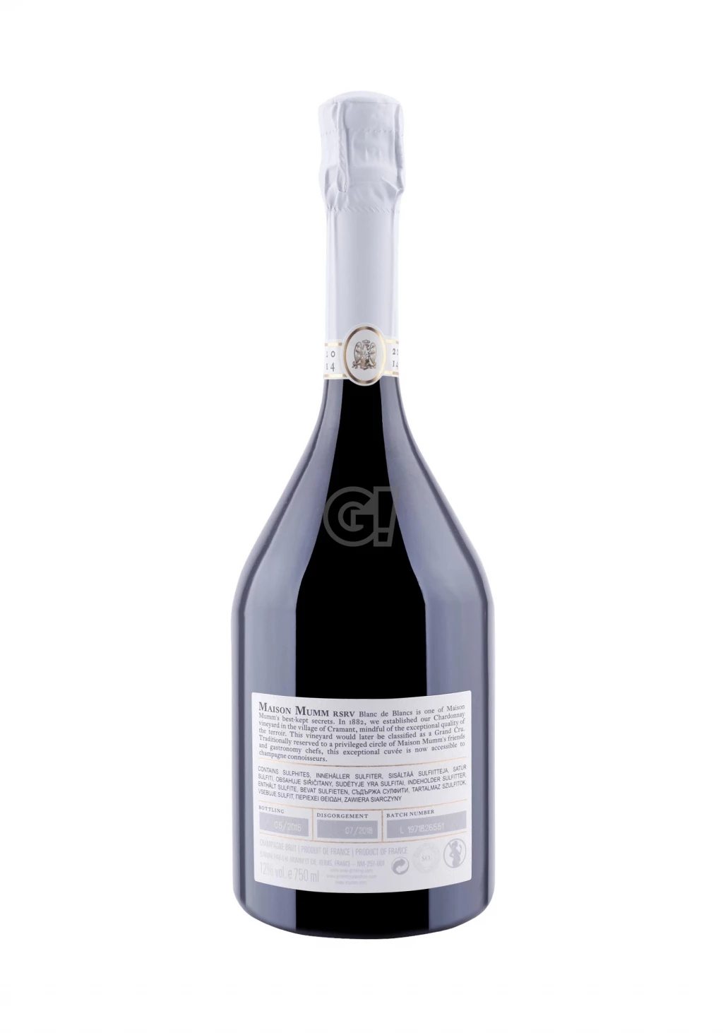 The Champagne RSRV Blanc de Blancs 2014 by Maison G.H. Mumm is an extraordinary exceptional Cuvée released in limited quantities. Fruit of 100% Chardonnay from the best vineyards located in Cramant, a village classified as Grand Cru in the renowned Côte des Blancs, over a rich and chalky terroir, which has belonged to the Maison since 1882, it is an elegant and pure Champagne Blanc de Blancs.