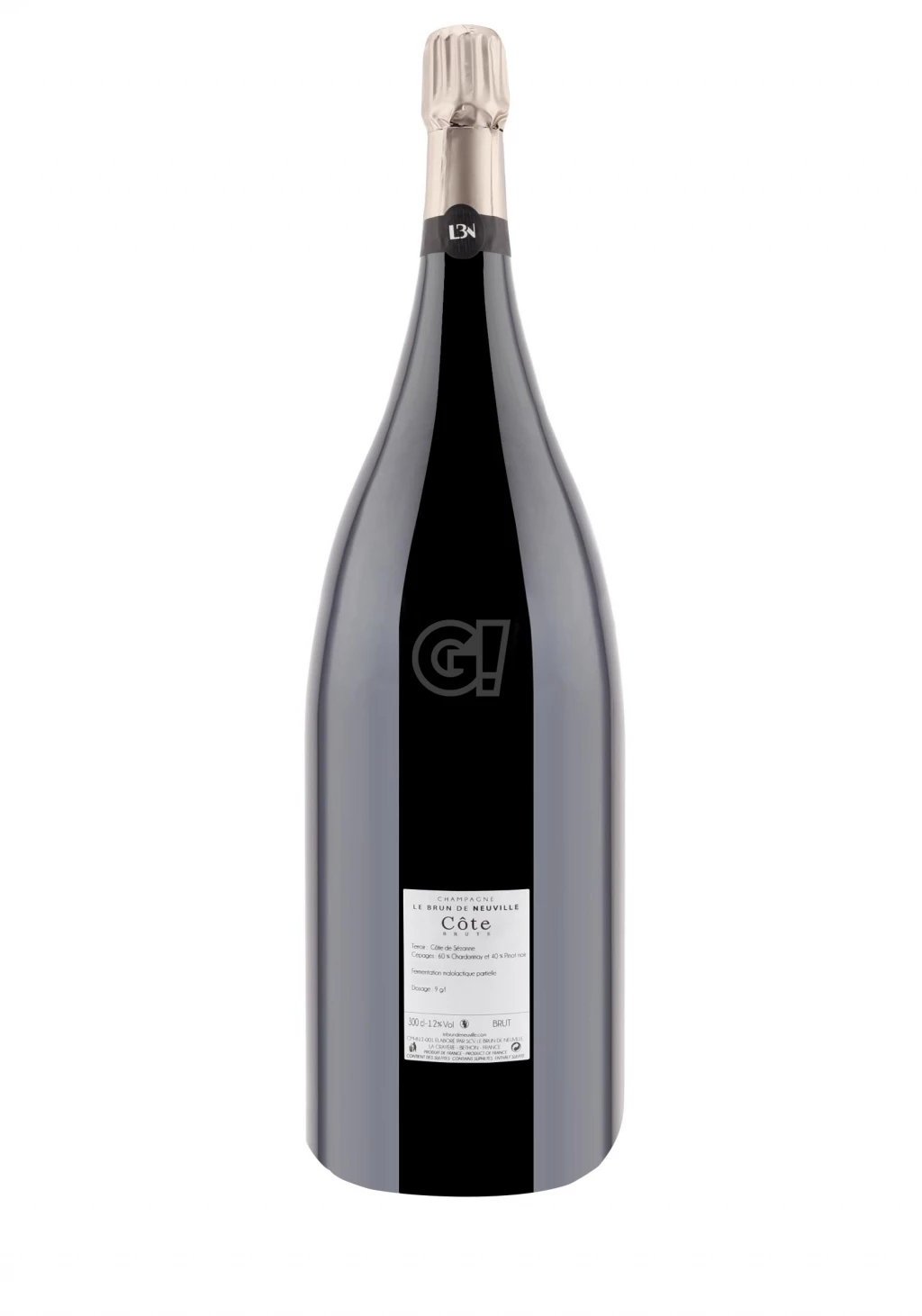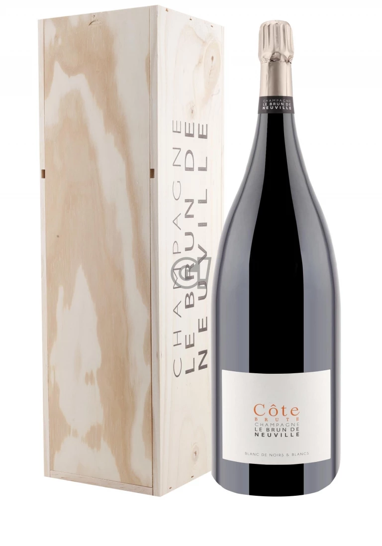 The Champagne Côte Brute Jéroboam by Le Brun de Neuville is a blend of 60% Chardonnay and 40% Pinot Noir, harvested from 45-year-old vines with a south-eastern exposure on clay and chalk soils in the Côte de Sézanne area. Harvest base 2014 with 50% vin de réserve, alcoholic fermentation in steel tanks and 4% oak barrels with ageing on its own yeasts for at least 36 months.
