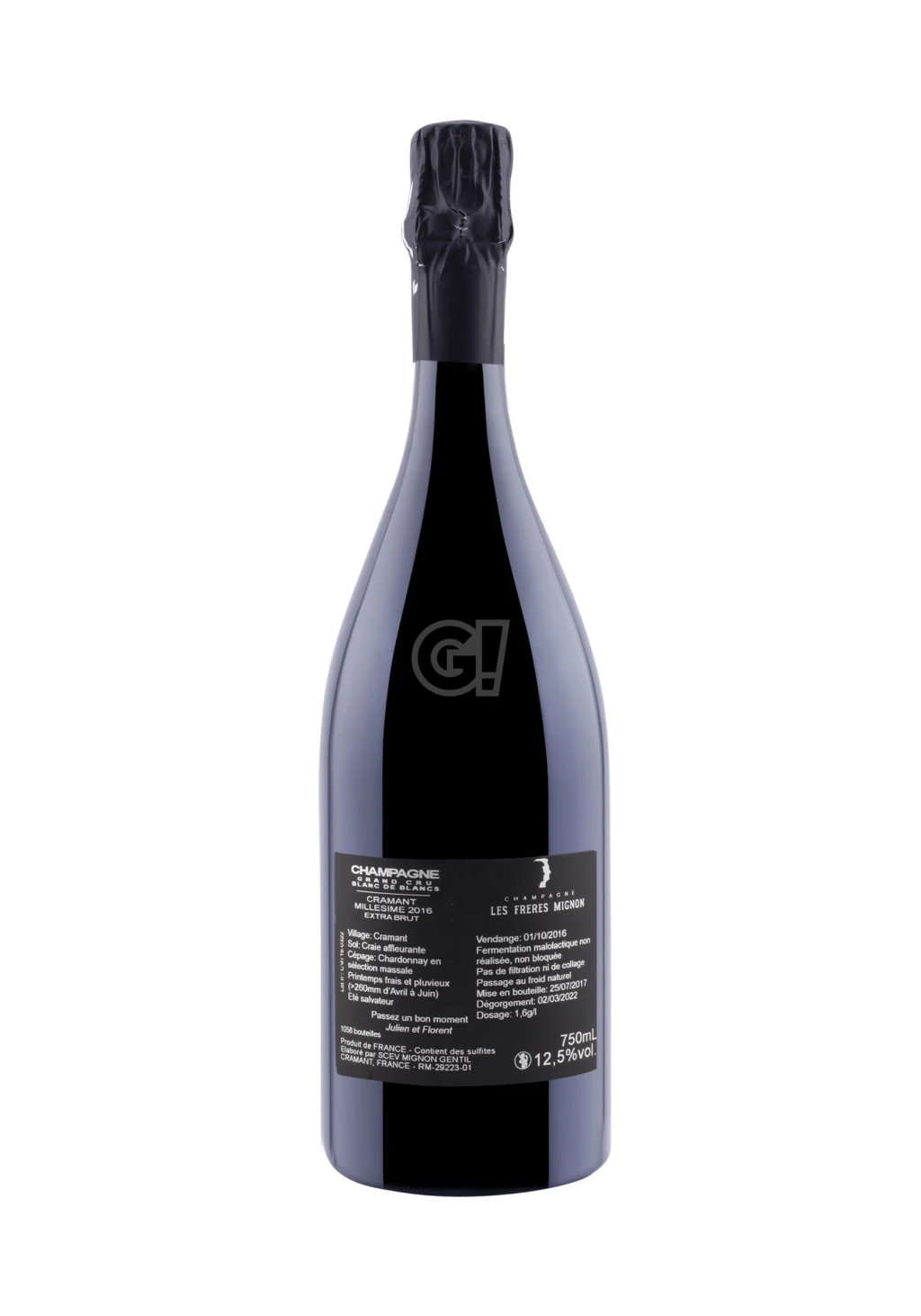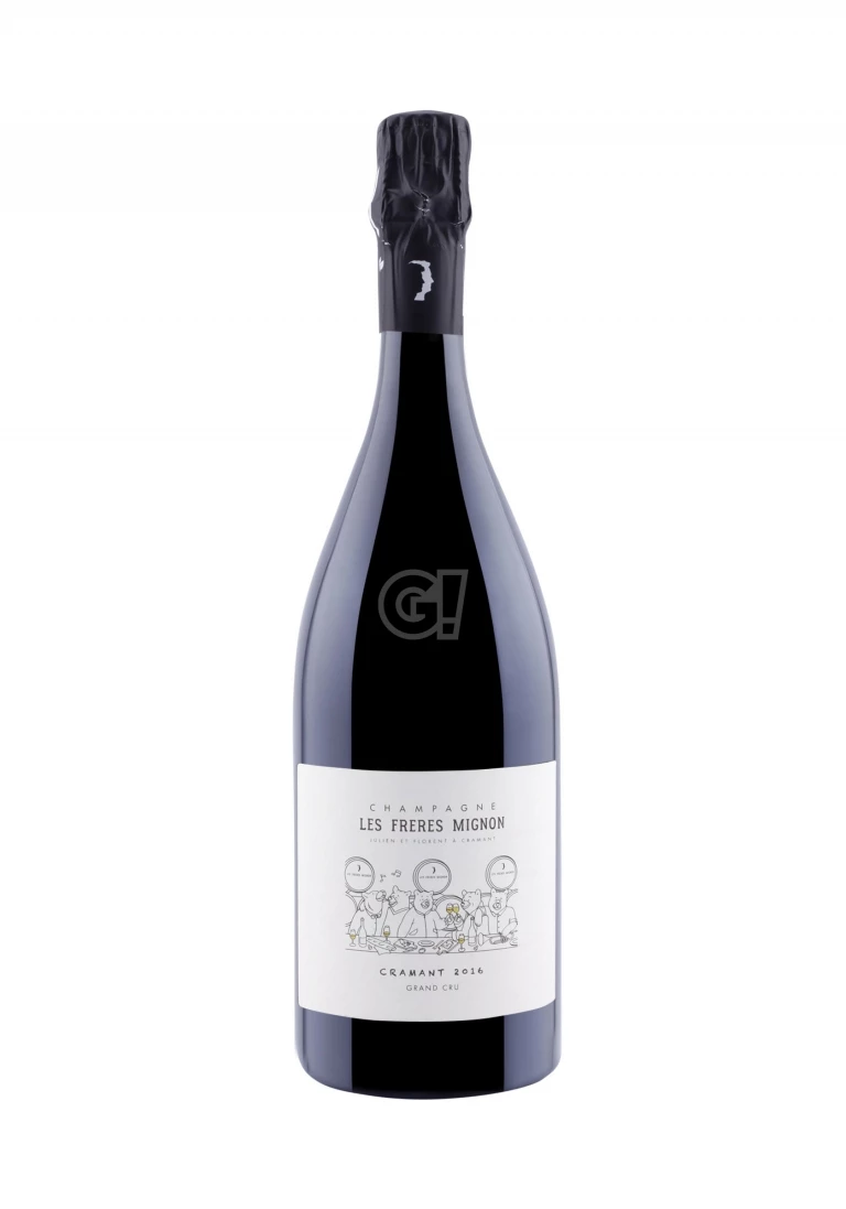 The Champagne Cramant Millésime 2016 by Les Freres Mignon comes from the blending of 100% Chardonnay grapes from the village of Cramant, 100% Grand Cru within the area of the Côte de Blancs. The final dosage amounts to 1.6 g/l – making it an Extra Brut. This Champagne Blanc de Blancs has been produced by the brothers Florent and Julien in a limited quantity of only 1,058 bottles.