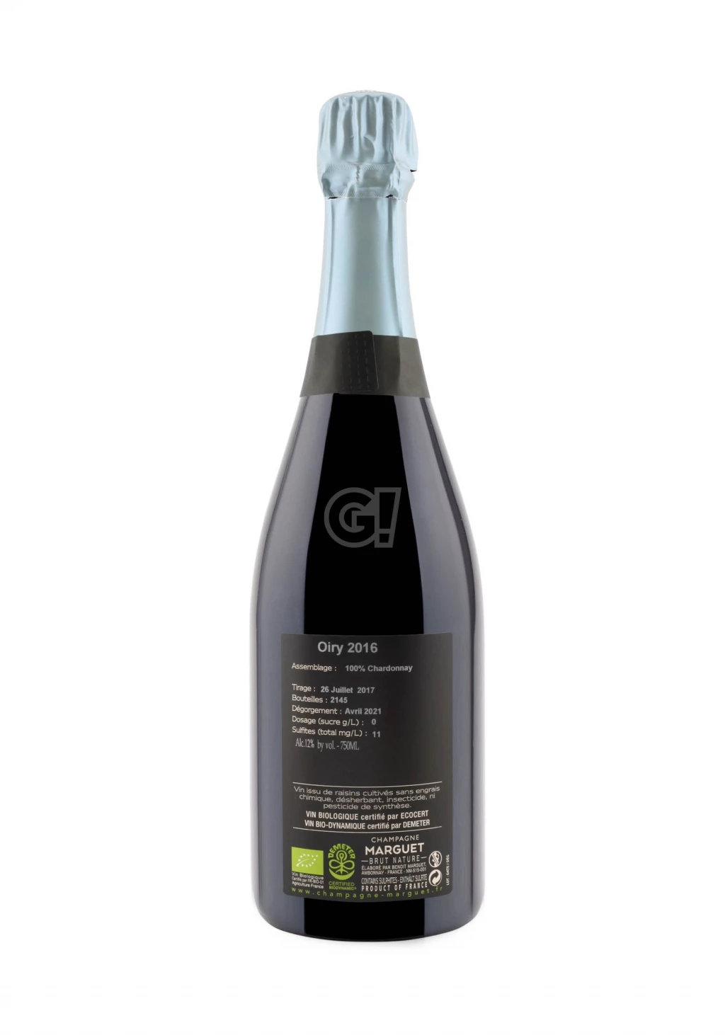 The Champagne Grand Cru Oiry 2016 by Marguet consists of 100% Chardonnay from grapes from old vineyards from the Oiry village, classified as 100% Grand Cru in the Côte des Blancs. No final dosage for this Champagne Brut Nature that expresses the uniqueness of the terroir of Oiry with refinement.