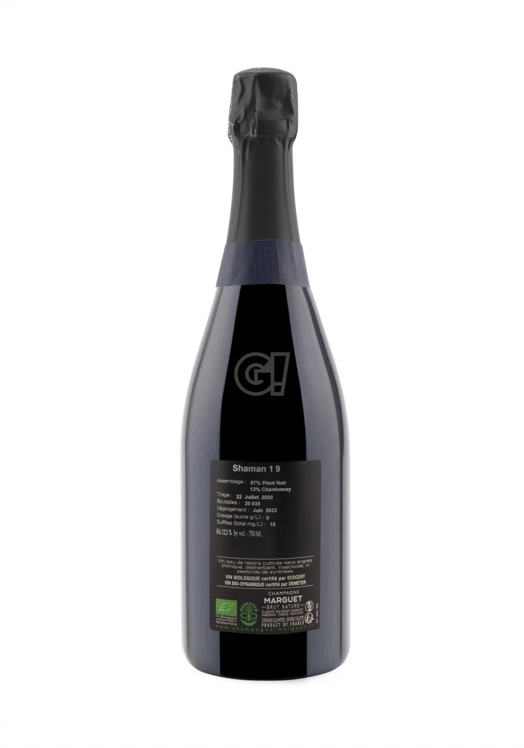 The Champagne Shaman 19 by Marguet is 87% Pinot Noir and 13% Chardonnay from old vineyards located in Ambonnay, classified as 100% Grand Cru in the renowed Montagne de Reims. 87% from vintage 2019 with 13% vin de reserve for this complex, structured and elegant Champagne Brut Nature complex, structured and elegant.