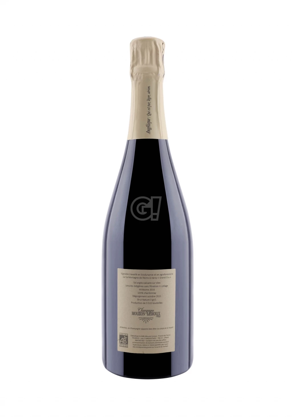 The Champagne L’angélique 2016 by Mouzon Leorux is the result of 100% Chardonnay harvested in the village of Verzy, classified as 100% Grand Cru in the Grande Montagne de Reims area. Harvest 2016 and vinification in fûts de chêne, 48 months on yeasts and a zero final dosage of 2 g/l – Brut Nature – for this fantastic Champagne Blanc de Blancs, produced in an extremely limited quantity of only 3,515 bottles.
