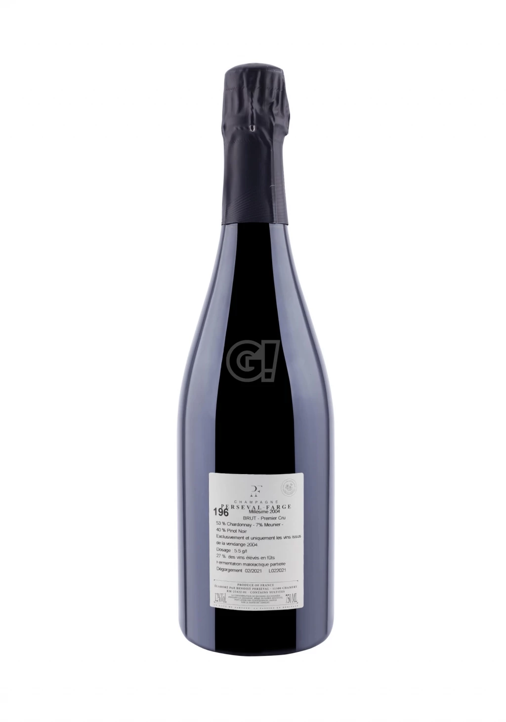 The Champagne Cuvée 196 Millésime 2004 by Perseval-Farge is composed of 53% Chardonnay, 7% Meunier and 40% Pinot Noir, from the village Premier Cru of Chamery, in the Montagne de Reims. This Cuvée Millésime of the Domaine Perseval-Farge ferments for a part in steel and for about 27% in oak barrels, only partially carrying out the malolactic fermentation. The dosage is 5.5 g/l of sugar – making it a Brut.