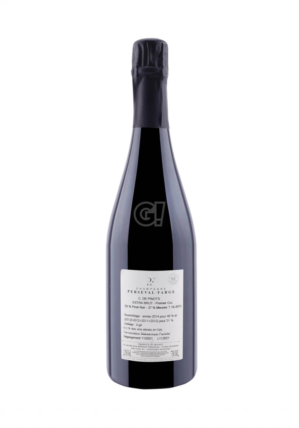 The Champagne C. de Pinots Zéro Dosage by Perseval-Farge is composed of 63% Pinot Noir and 37% Meunier, which come from the vineyards of the village classified as Premier Cru of Chamery, within the area of the Montagne de Reims. The vinification of this cuvée, fruit of 4 different vintages, involves a part of the fermentation in steel tanks and a remaining 20% in oak barrels, for a total of 60 months on its own yeasts. The malolactic fermentation is partially carried out by the must and the expected dosage is 0 g/l of sugar – making it a Brut Nature.
