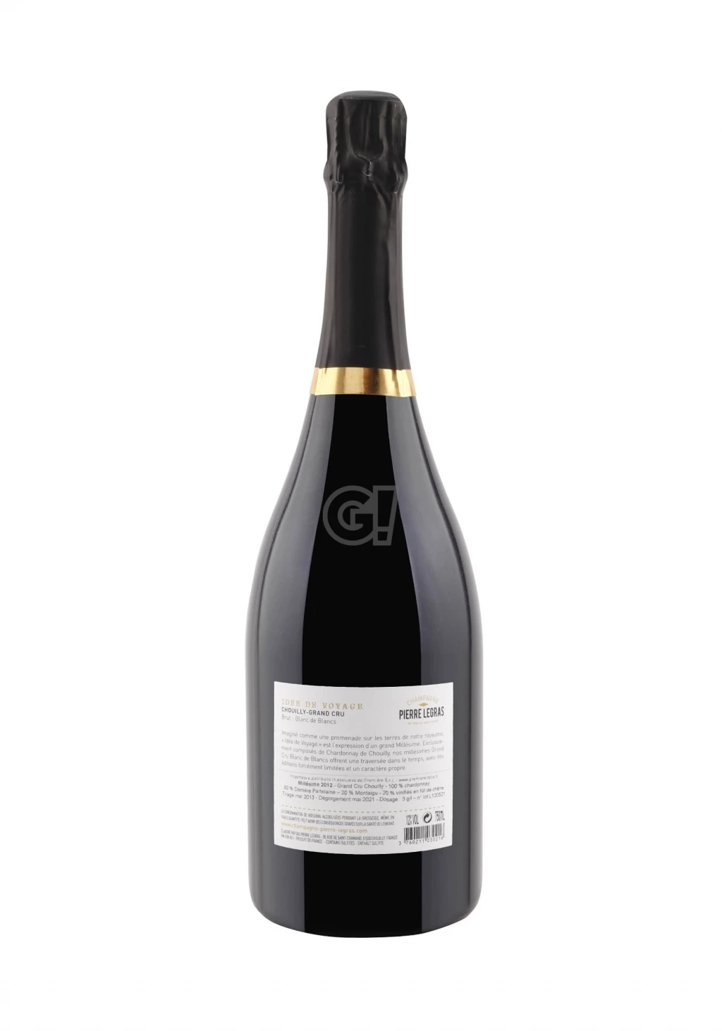 The Champagne Idée de Voyage 2012 by Pierre Legras is a Blanc de Blancs resulting from 100% Chardonnay grapes harvested in the best vineyards located near the village of Chouilly, 100% Grand Cru of Côte des Blancs. Vinification occurs 20% in fût de chêne and the wine ages for more than 8 years on its own yeasts. Dosage of 3 g/l – making it a Brut – for this exclusive expression of a great Champagne Millésime.