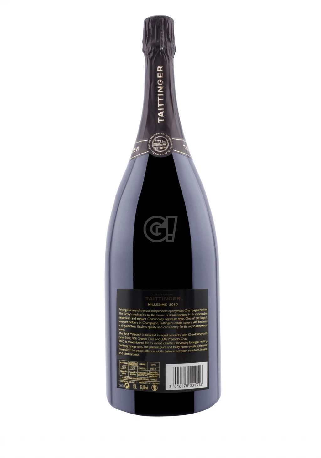 The Champagne Millésime 2015 by Maison Taittinger is produced exclusively from first-pressing grapes, in a blend of 50% Chardonnay and 50% Pinot Noir, 70% of which come from villages classified as Grand Cru and 30% from other selected villages classified as Premier Cru. Aging on its own yeasts in the cellar for over 5 years increases complexity and helps the wine to flourish.